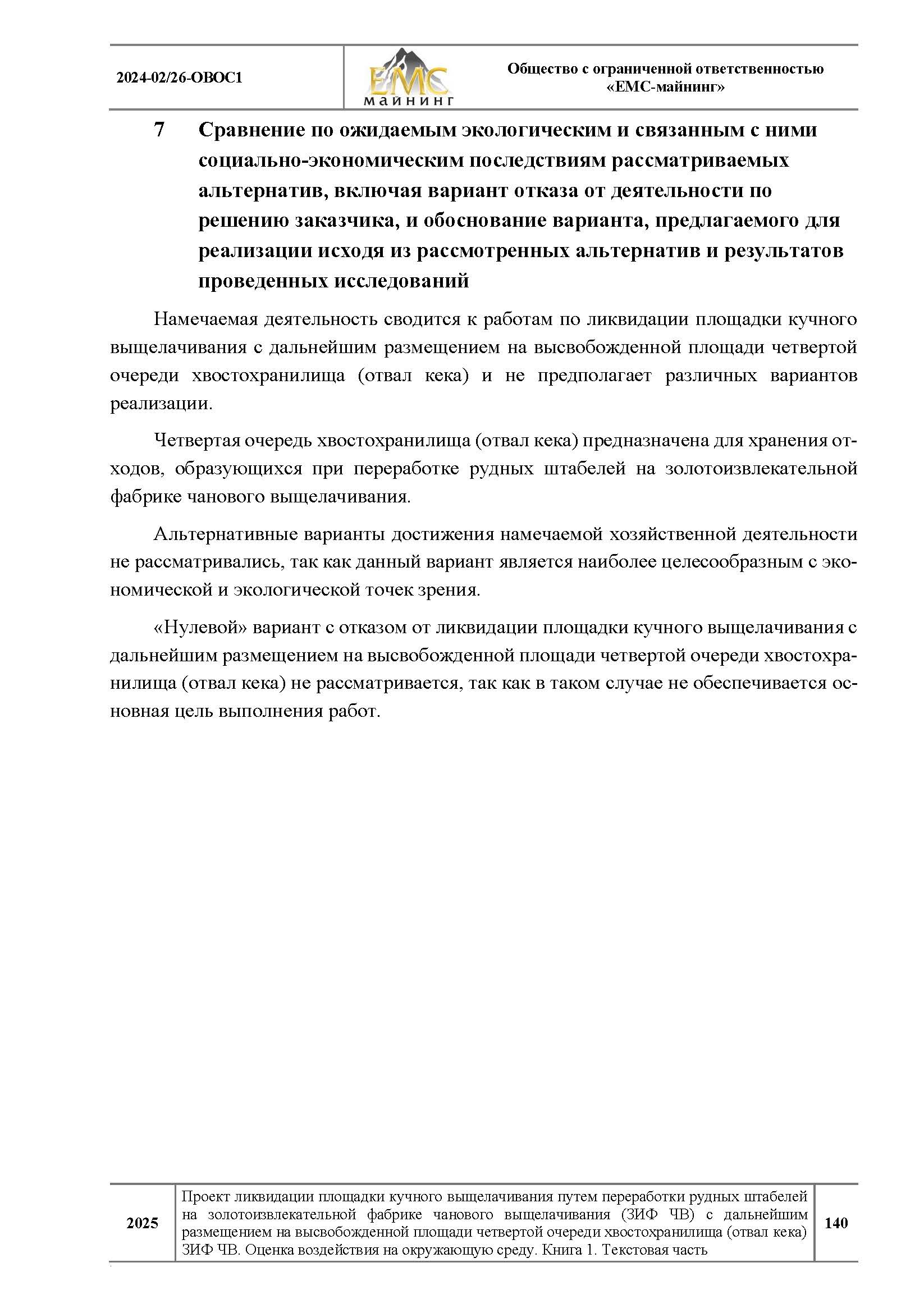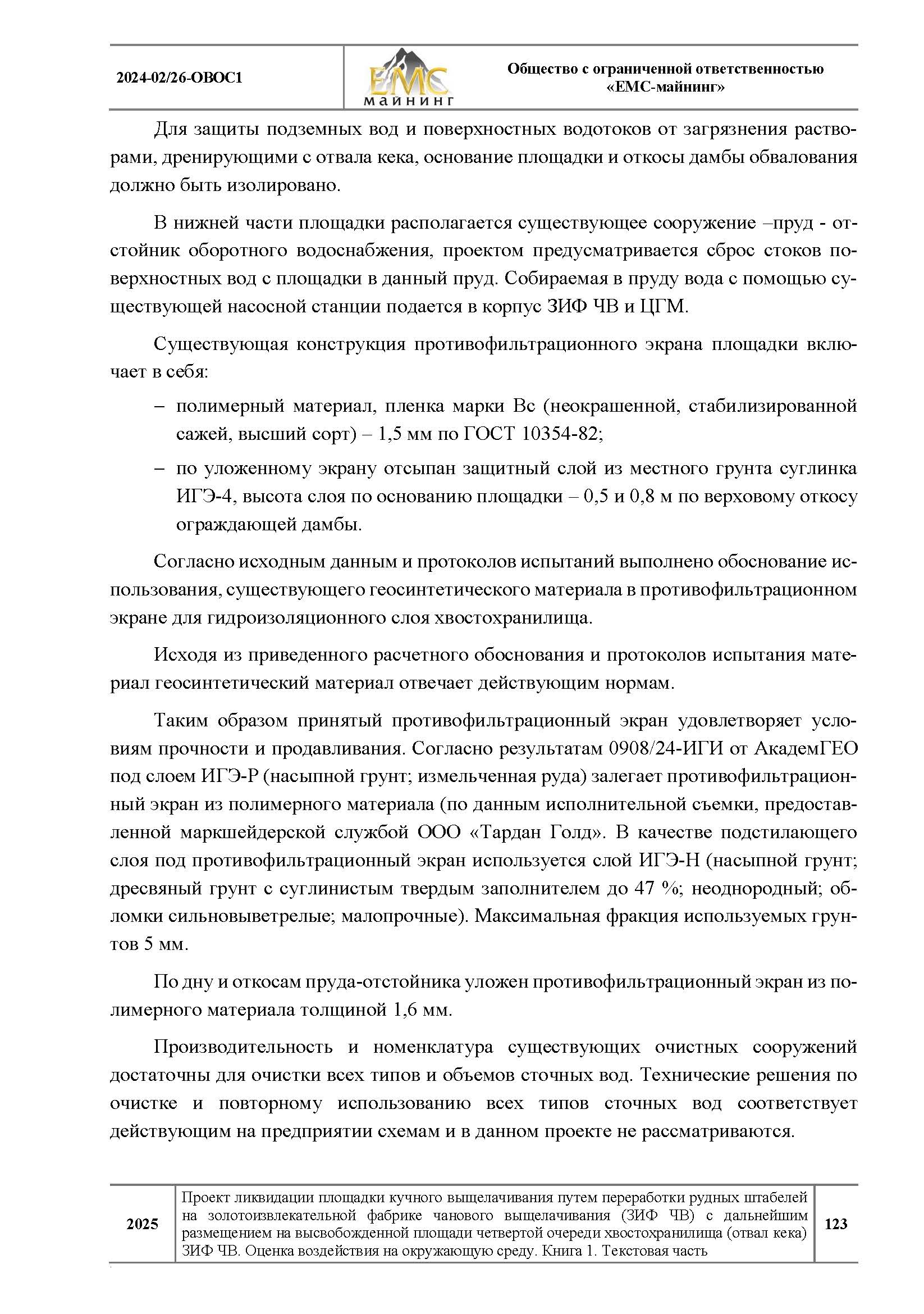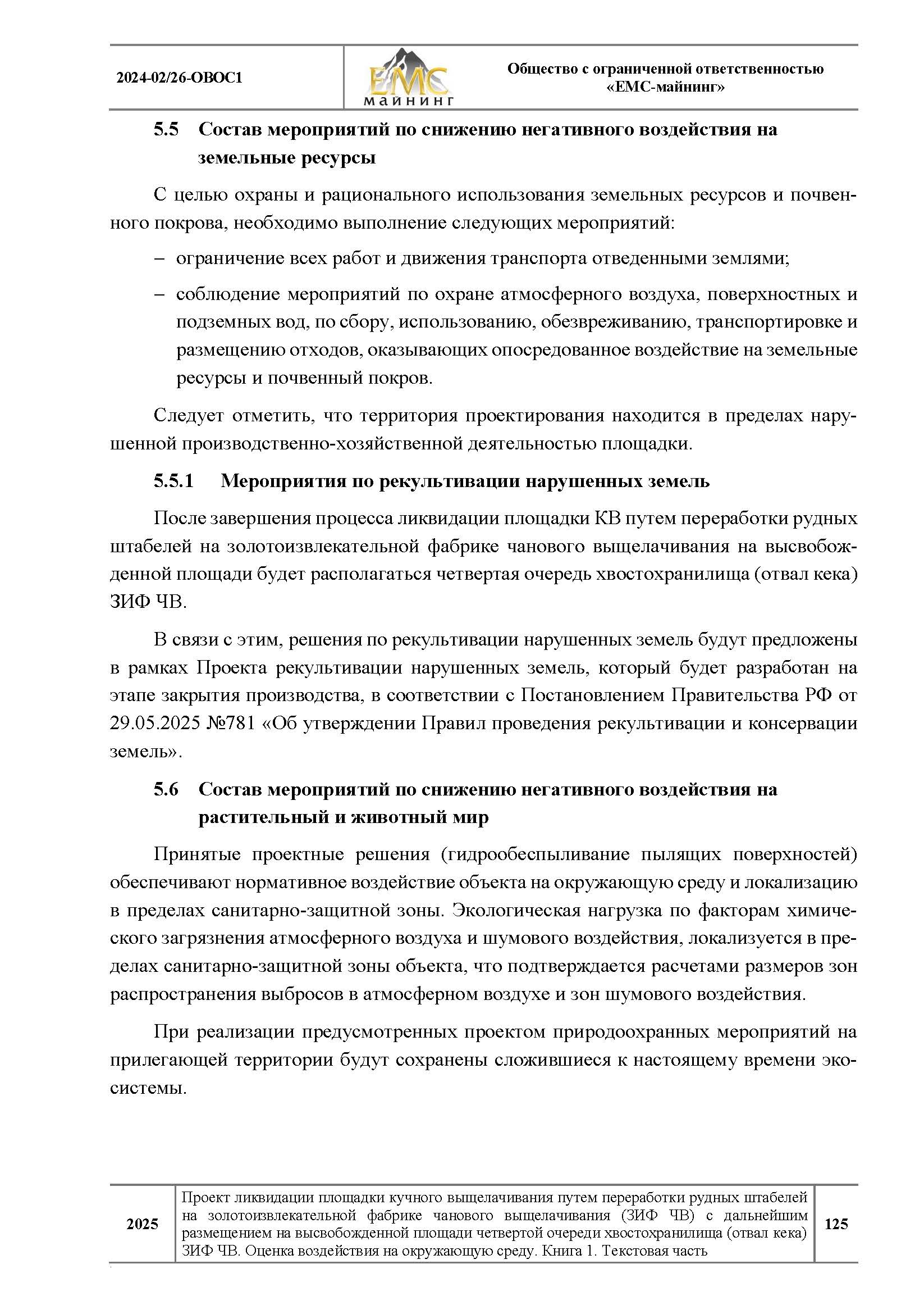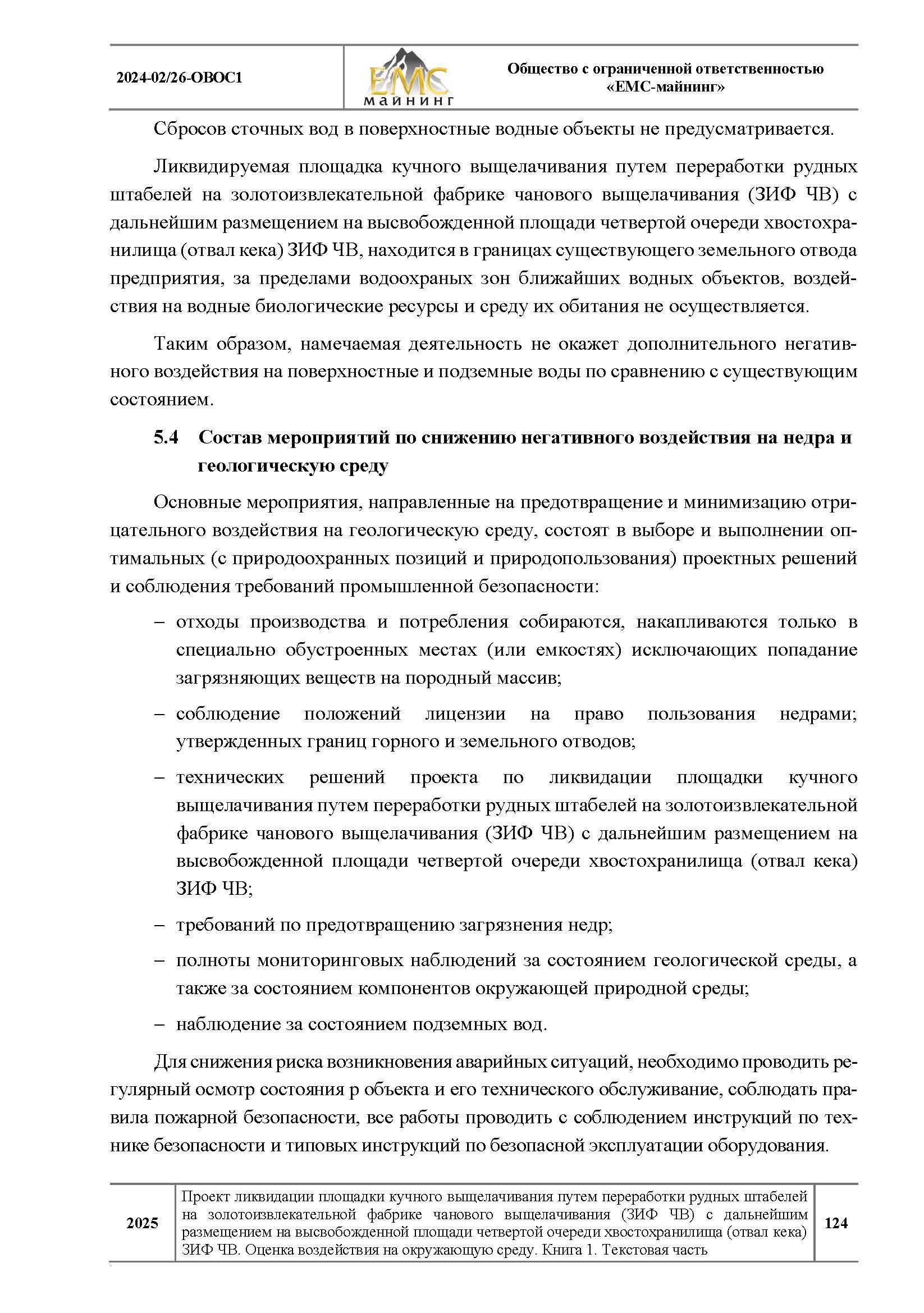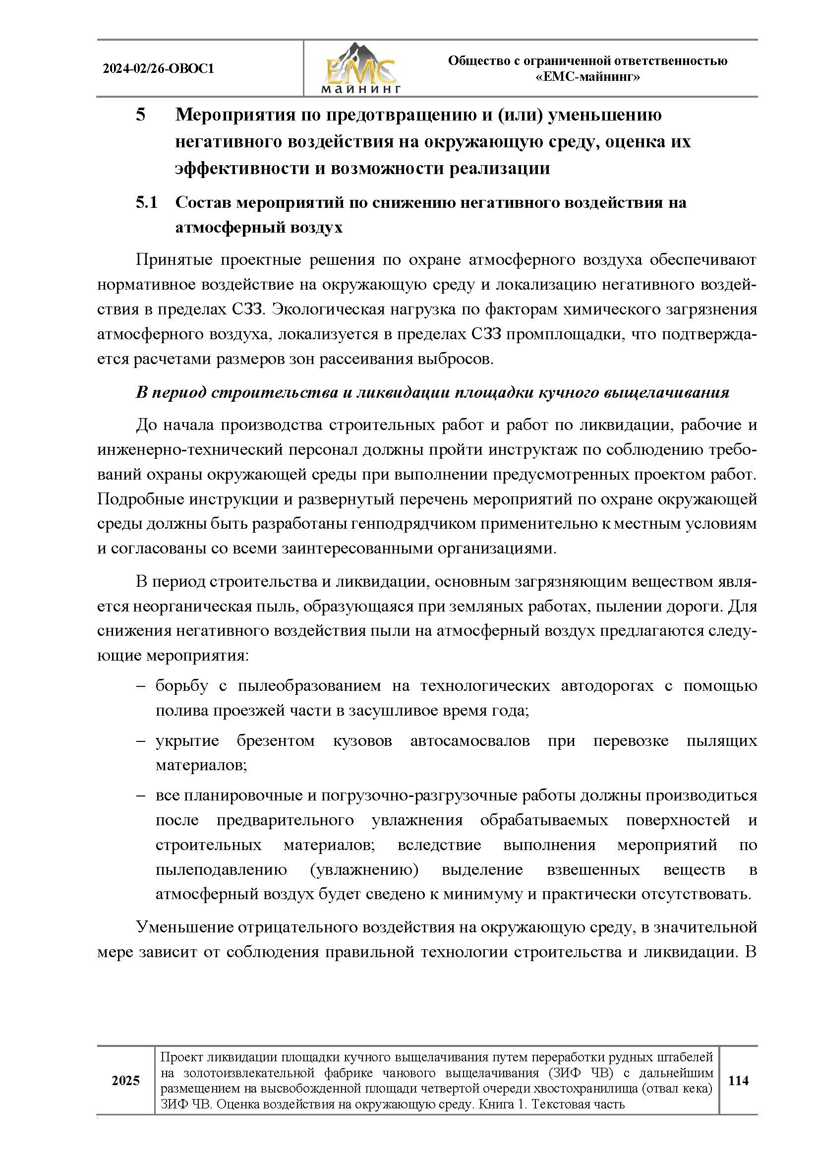 Проект ликвидации площадки кучного выщелачивания путем переработки рудных штабелей на золотоизвлекательной фабрике чанового выщелачикания (ЗИФ ЧВ) с дальнейшим размещением на высвобожденной площади четвертой очереди хвостохранилища (отвал кека) ЗИФ ЧВ